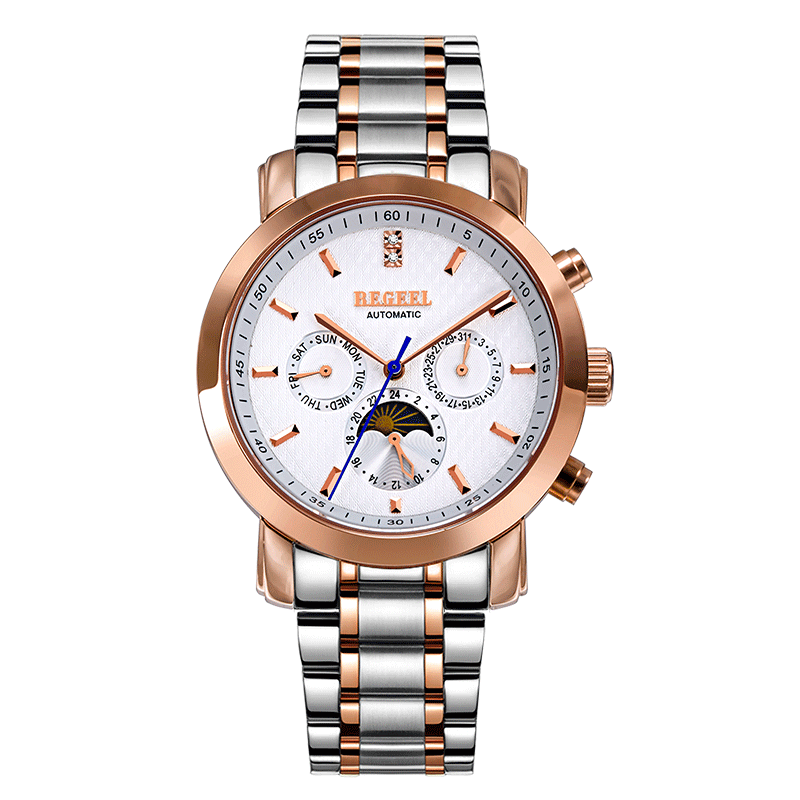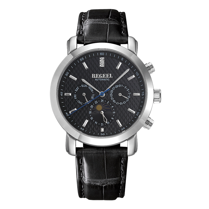多功能表盤,天然真鉆,2顆天然真鉆鑲嵌于12點(diǎn)位的時(shí)標(biāo)之上,3點(diǎn)位的日期顯示盤,9點(diǎn)位的周歷顯示盤分布于表盤中軸線的左右,盡顯對(duì)稱之美。6點(diǎn)位是日月星辰24小時(shí)制顯示盤,日間一顆金色太陽隨著時(shí)間的流逝逐漸落下,到夜間被一輪明月取代,讓您時(shí)刻區(qū)分白日與夜間時(shí)分。而24小時(shí)制顯示盤,與日歷、月歷顯示盤左右逢“圓”,盡顯成人之美,也祝愿著您事事稱心如意。三紋合一,巴洛克紋飾、光環(huán)紋飾與麥穗紋飾分布于表盤,展高超雕刻技藝和設(shè)計(jì)美學(xué),讓表盤更顯立體美觀。