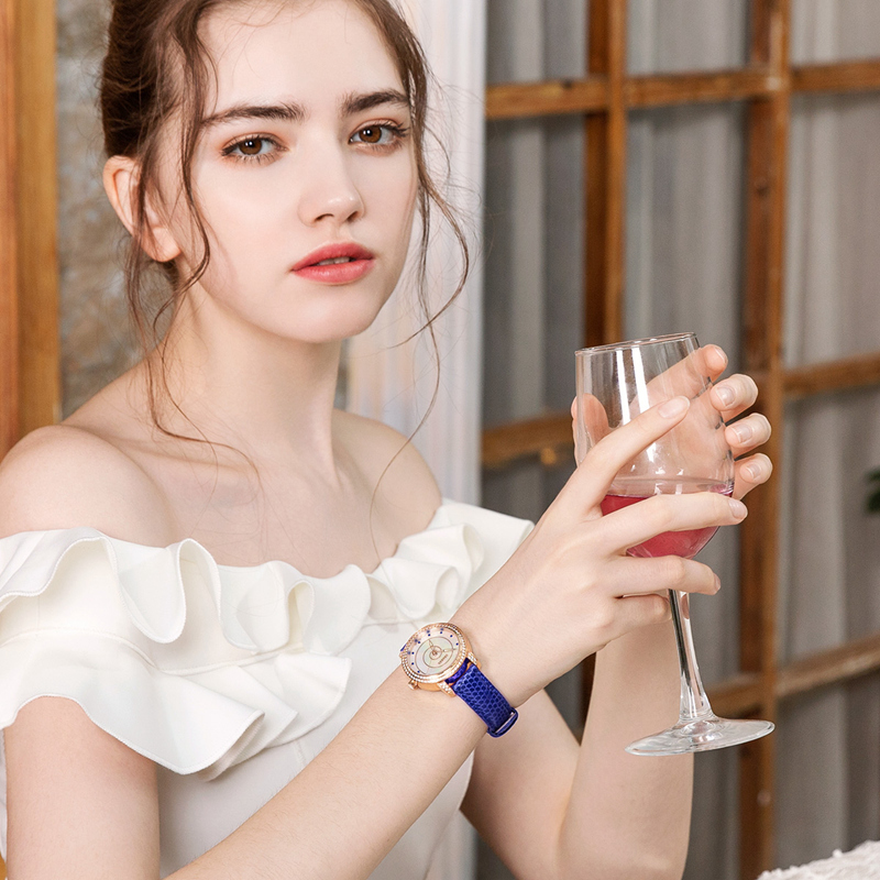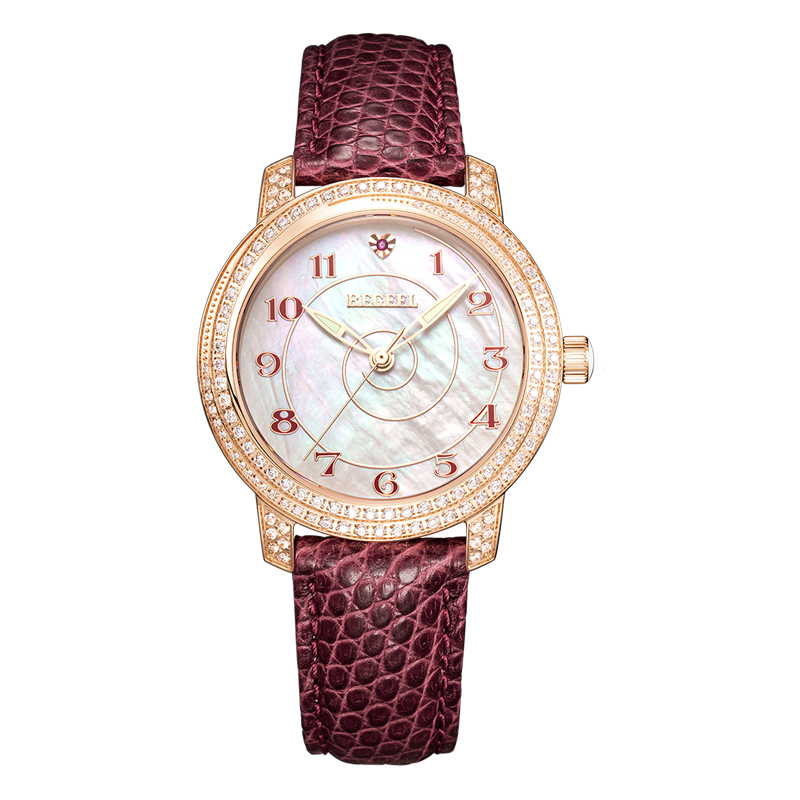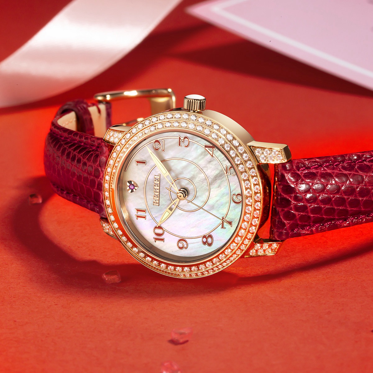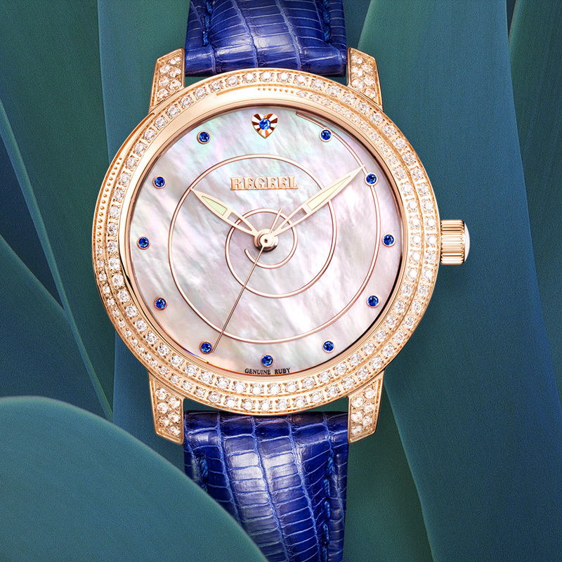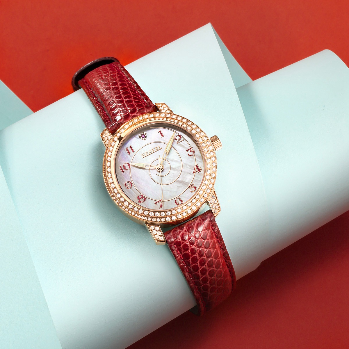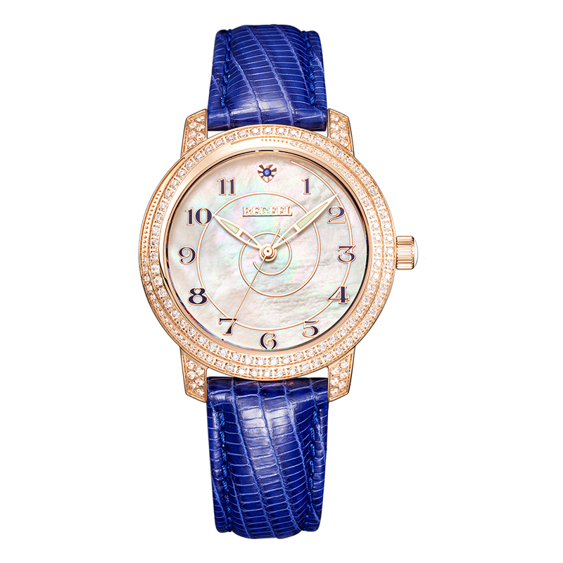 COLLECTION·珍藏系列-靈感來源于藝術(shù)體操中飛舞的絲帶,時而柔美時而輕盈飄逸,以螺旋概念為設(shè)計(jì)主題,運(yùn)用鉆石、珍珠貝母,由表面中間向外旋轉(zhuǎn)布陣,表殼鑲100粒水鉆,配襯紅色寶石時刻,藍(lán)色阿拉伯?dāng)?shù)字刻度,用絲帶的婉約去碰撞珍珠母貝與滿天星水鉆,鉆石形成的螺旋形圖案更加矚目。優(yōu)雅風(fēng)范,展現(xiàn)女性柔美。