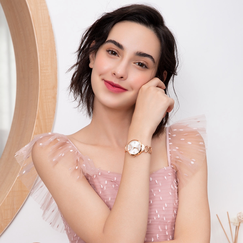 表殼:316L鋼/電鍍玫瑰金 耳位鑲12+12顆水鉆,跟字面結合成圓形