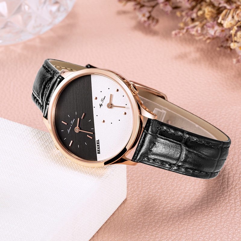 設計靈感來源于鋼琴上的黑白鍵,表盤雖然一半黑一半白,但仍十分和諧舒服。黑白相間的純粹之色,簡潔明快的流暢線條,演繹簡而不凡,雙時區功能,異地戀也可以愛沒有時差!將濃濃愛意相系腕間,釋放出純粹和永恒的魅力。