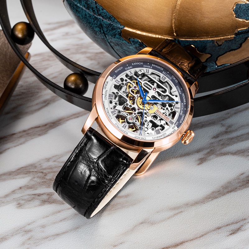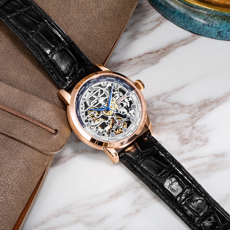環游世界是很多人的夢想,周游列國,欣賞形形色色的風土人情,暢想著其他地區的生活狀態。以此理念為設計思路,賓爵設計師將代表世界各地的24個時區刻畫在表盤字面的外圈,以北京時間為基礎,通過簡單的換算,讓你輕松掌握世界各地的時間。