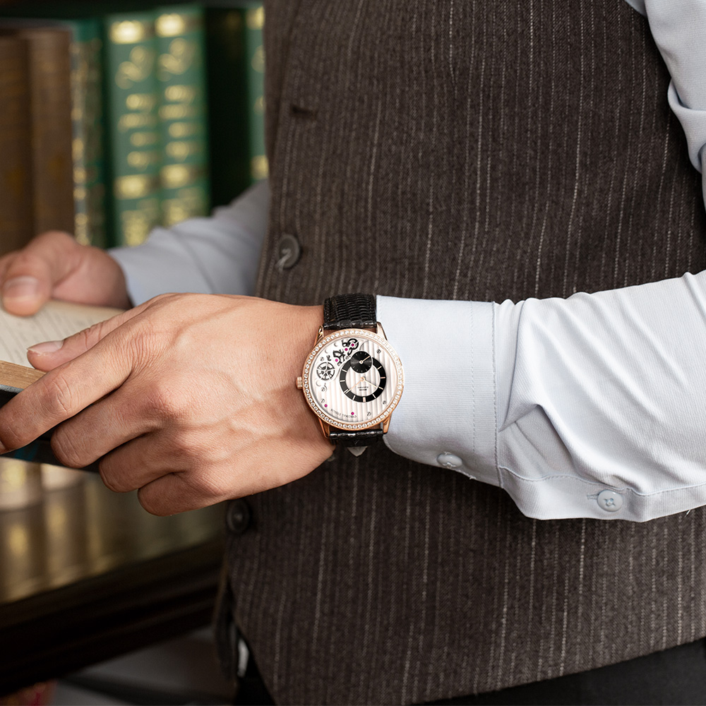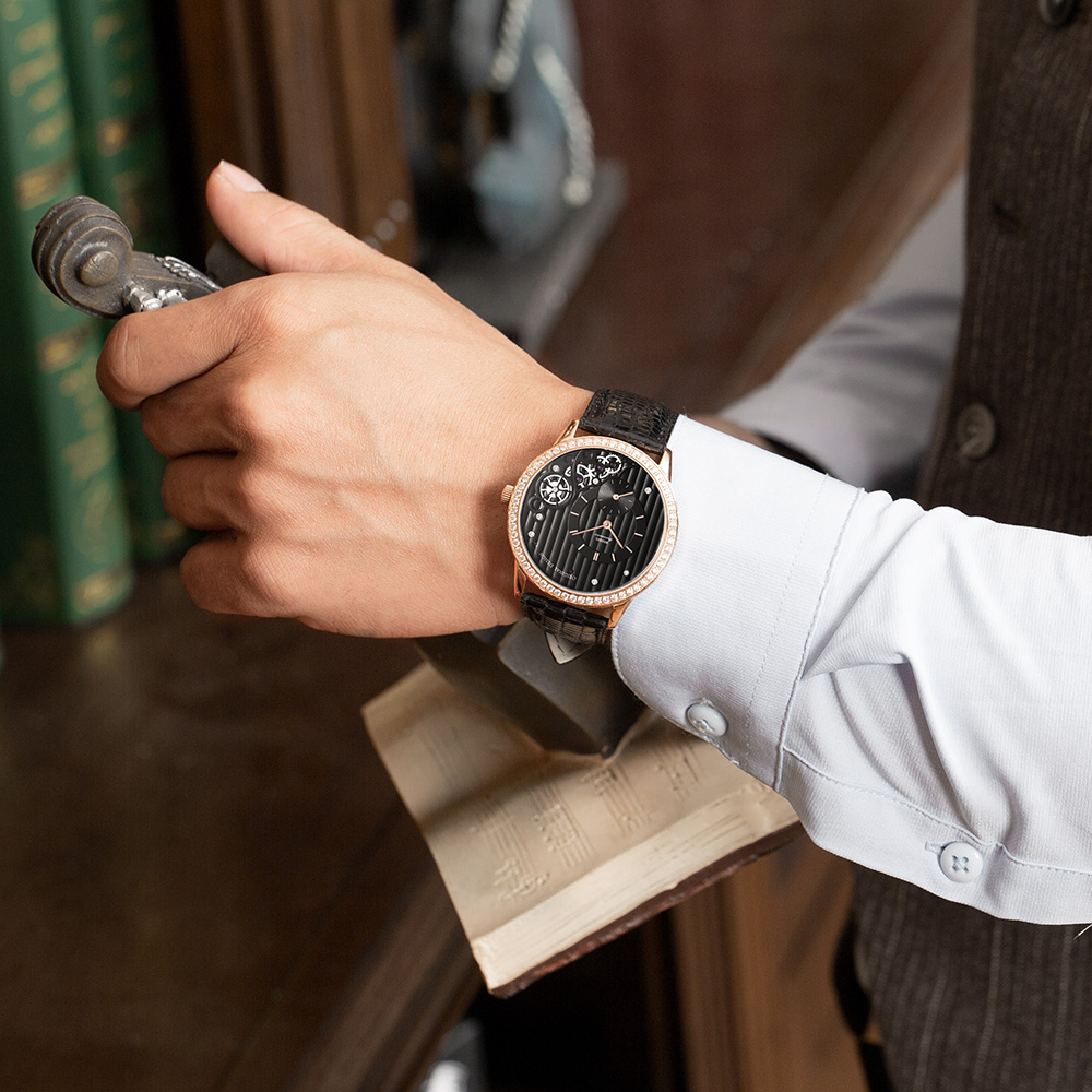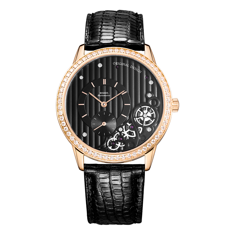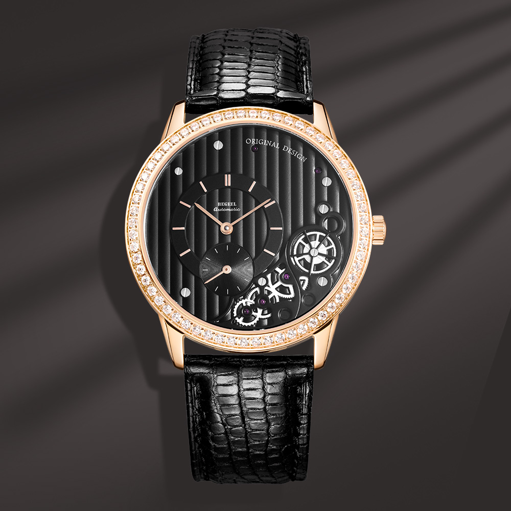 捕捉流變的光與影,黑色圓環狀表盤,機芯結構設計,就像夜幕下的城市光影背后,給人無限想象,領略不一樣的精彩。腕表摒棄傳統腕表設計,帶來更加強烈的視覺沖擊,表殼的外形線條規整簡潔,并鑲飾一圈水鉆點綴,奢華中又透出幾分簡單率性的現代氣質,將賓爵機芯的優良品質與充滿設計感的表盤,能夠看到齒輪、精巧部件的韻律,讓腕表充滿了機械的魅力。