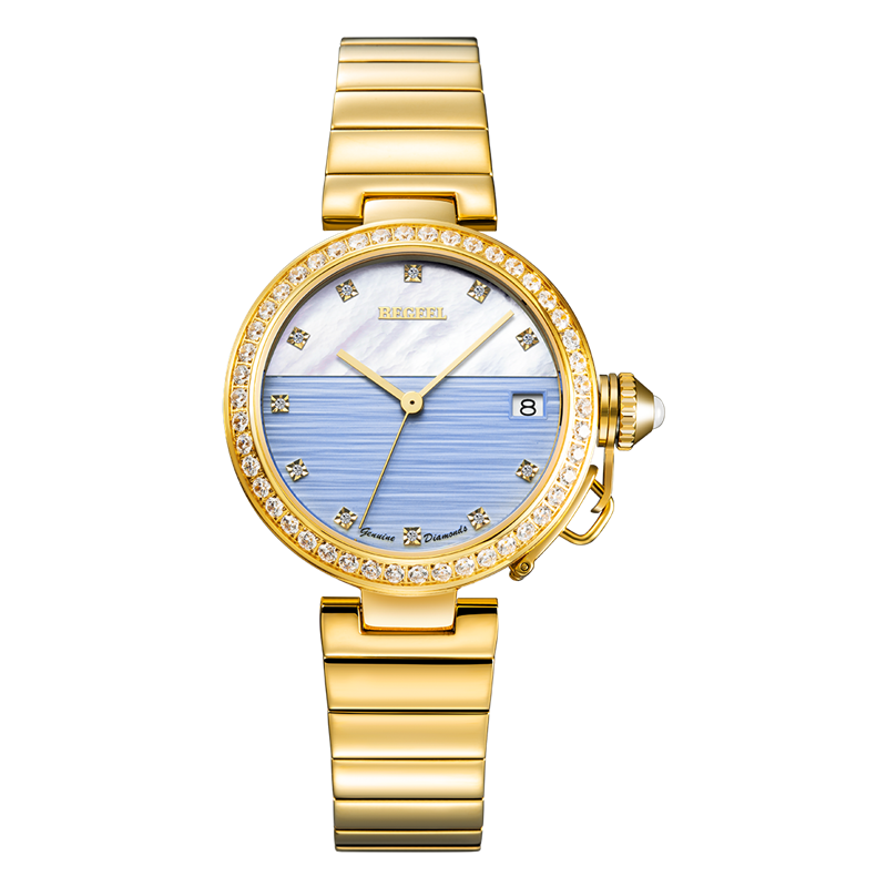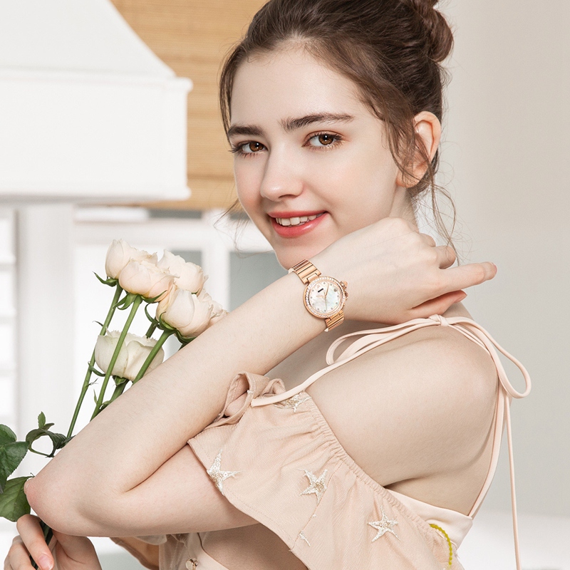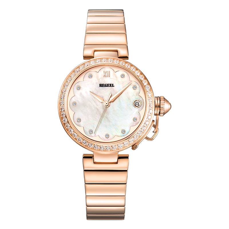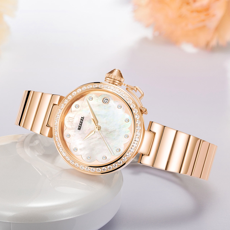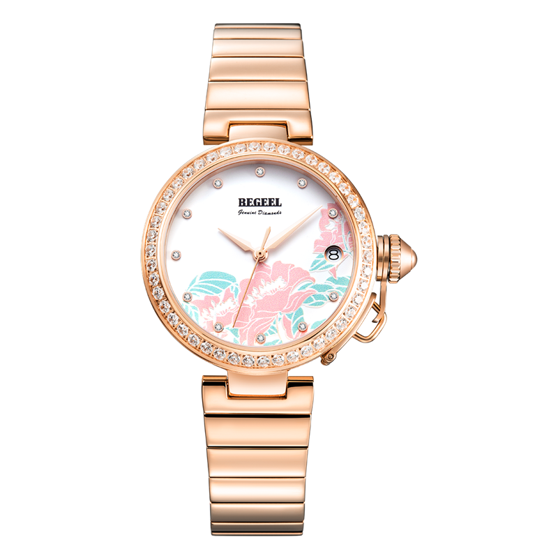 本款的字面設(shè)計(jì)取自“花朵盛開(kāi)在太陽(yáng)初升時(shí)”的場(chǎng)景,外部一圈形似花瓣的輪廓,以珍珠母貝為底,幻彩的貝面反射光線(xiàn),就像一朵盛開(kāi)的嬌艷鮮花在朝陽(yáng)初升的迷朦霧氣中,若隱若現(xiàn);10顆水鉆作為時(shí)間刻度顯示,就像花瓣上晶瑩的露珠,折射出耀眼的光澤。旭日東升,花開(kāi)幾朵,象征著一天美好的生活