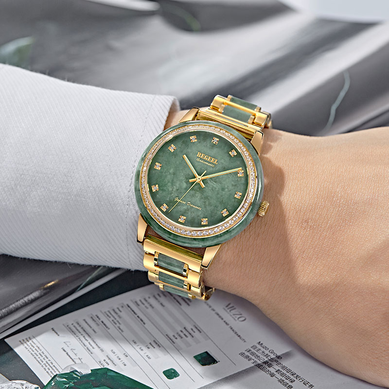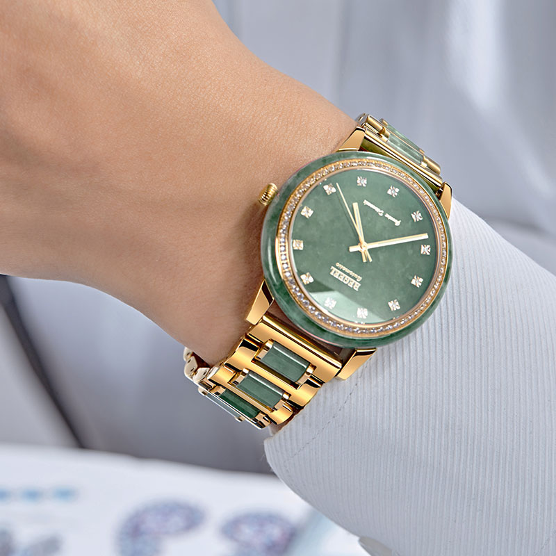 古人擅“借玉比德”,借玉之溫潤光潔喻君子高尚美德,并以身配美玉為雅事。從最初的玉璧、玉玨、玉佩到如今的吊墜手表,從古至今,君子與美玉的故事從未停止。賓爵表從中國傳統玉文化中汲取靈感,精選時下最為流行的翡翠玉石為主打元素,融合黃金之貴,鉆石之輝,打造出這款定制級奢華翡翠機械鉆表,金貴玉潤,自成一格。