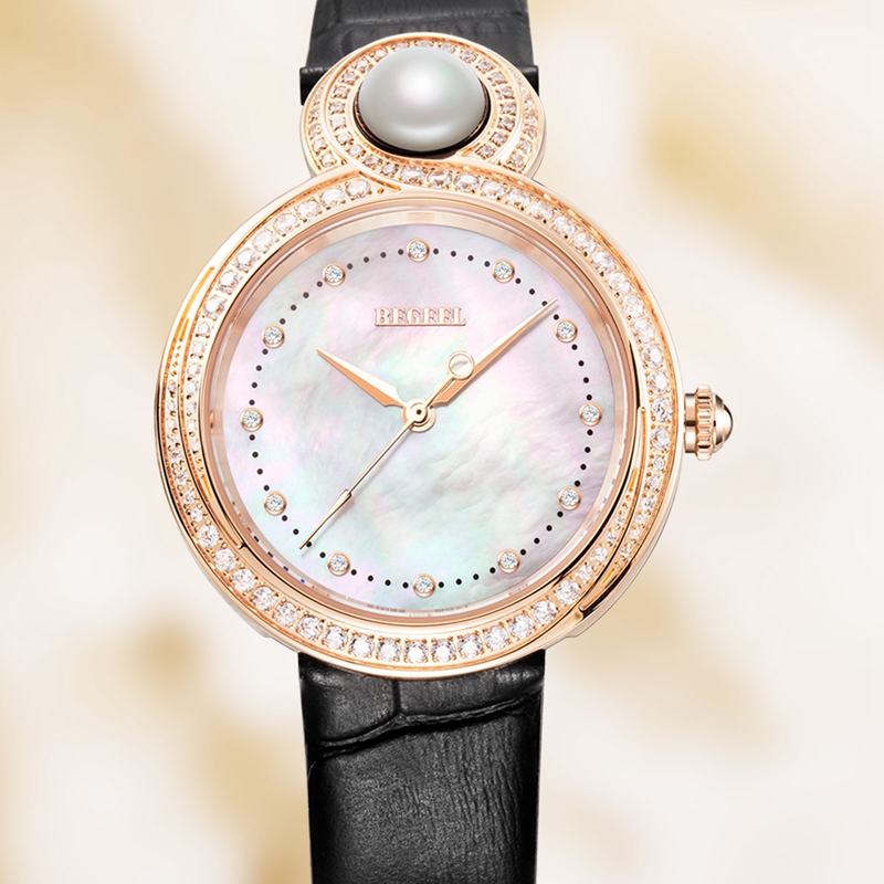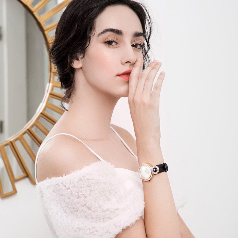 表殼:316L鋼 電鍍玫瑰金, 鑲水鉆共108粒, 12點位鑲珍珠 紫星云/湘妃玉/白晝翠