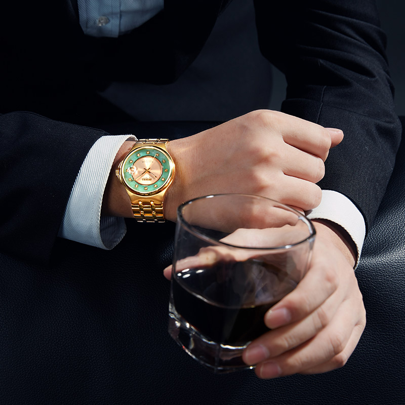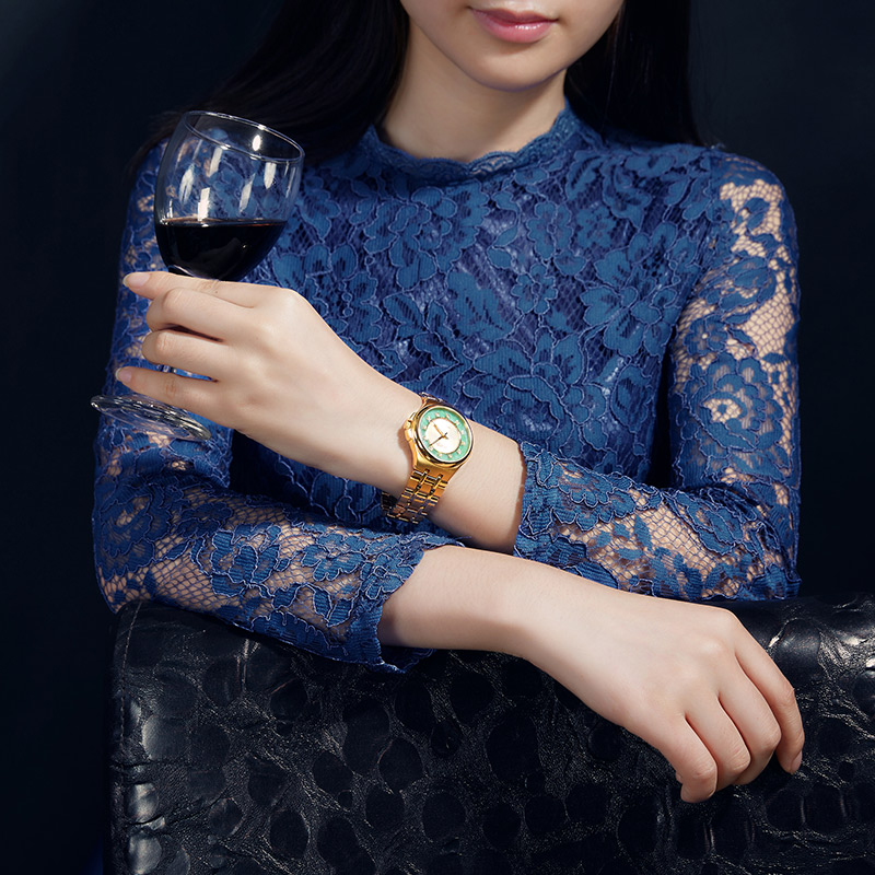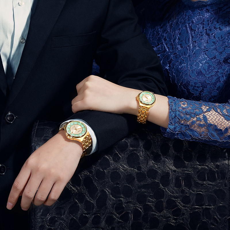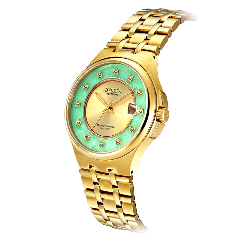 金,石之堅者,玉,石之美者,古人常以情比金堅,玉成良緣作金玉良緣之說,泛指美好的姻緣。賓爵設計師從中國傳統金玉文化中汲取靈感,將金玉的纏綿故事融入腕表設計,金色大三針小表盤外圈鑲嵌高品質硬玉翡翠玉環,靈感源自中國古代的龍紋玉璧,碧色玉環上以傳統金鑲玉工藝鑲嵌12顆天然美鉆,黃金的高貴、翡翠的溫潤與鉆石的璀璨和諧融于一體,暗喻金玉良緣,情久彌堅。