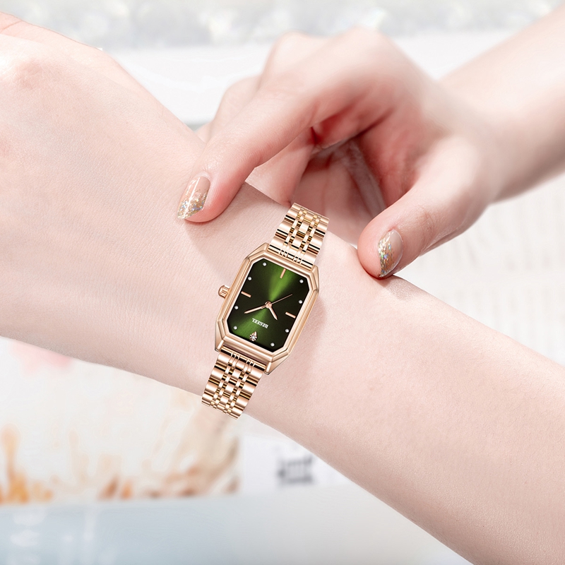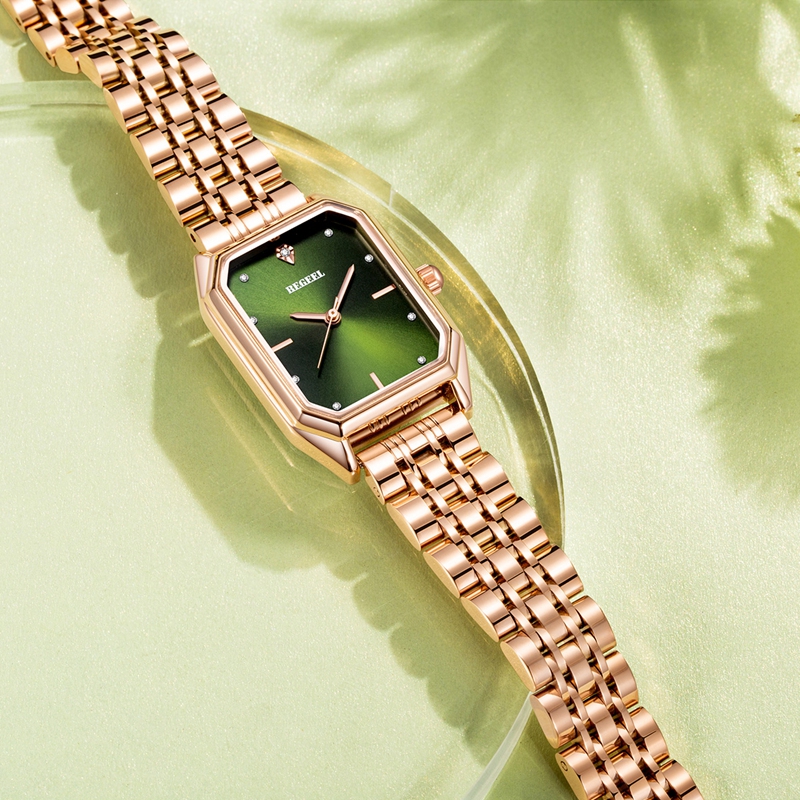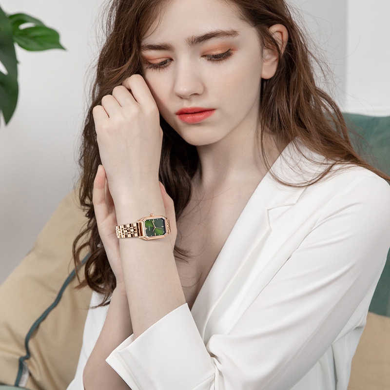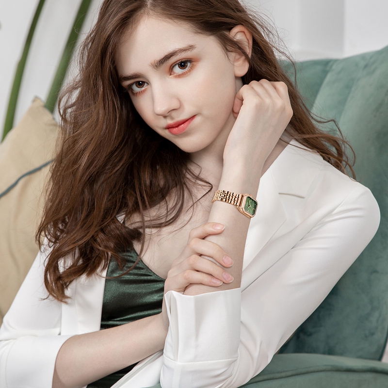 不似嫩綠的嬌俏,墨綠的深沉,代表著和平與希望的橄欖綠優雅獨樹一幟,有著歲月沉淀的內斂,光陰洗禮的含蓄。設計師從古希臘橄欖枝的色彩中汲取靈感,融入太陽紋細膩紋理使表盤產生幻變色彩,營造出溫婉柔美之感,仿佛可以凈化人的心靈,感受到和平與安寧。