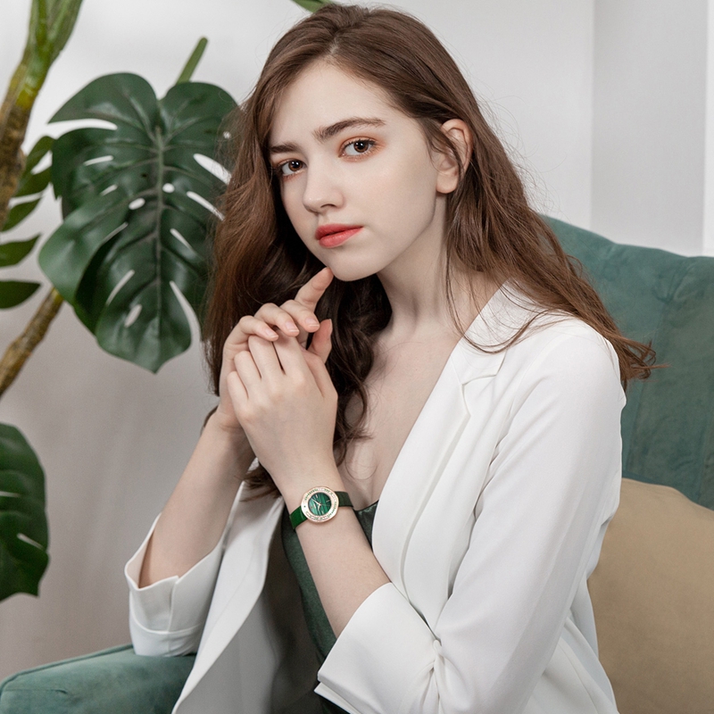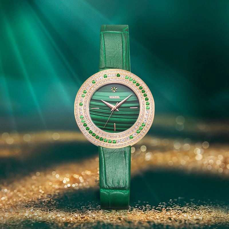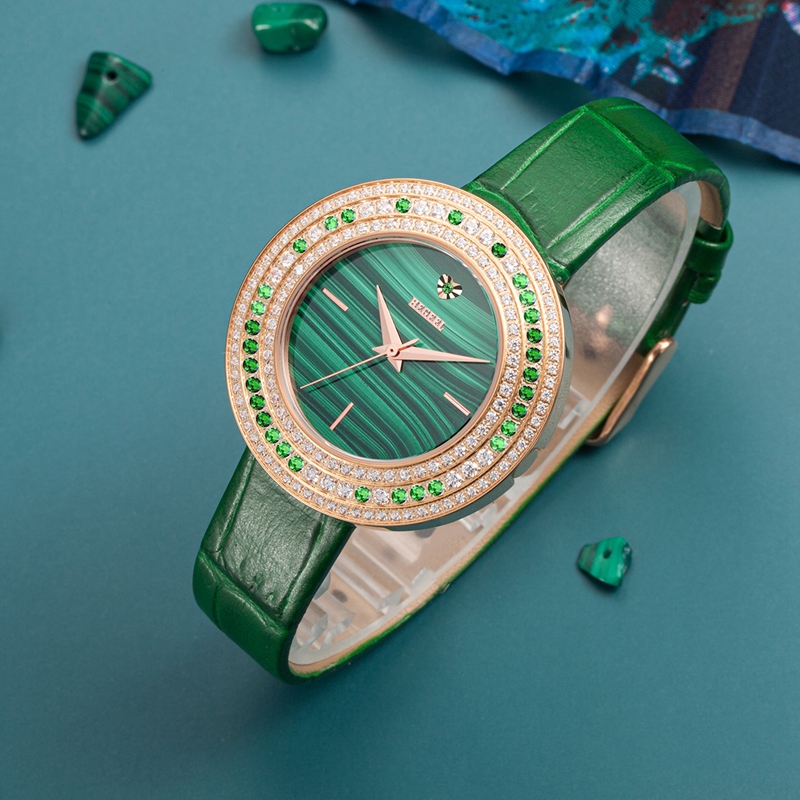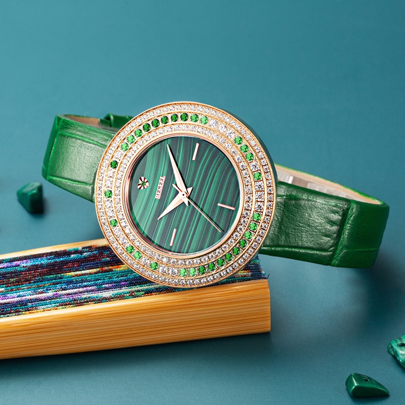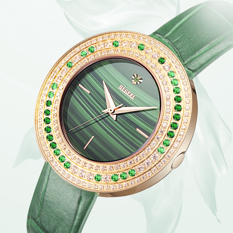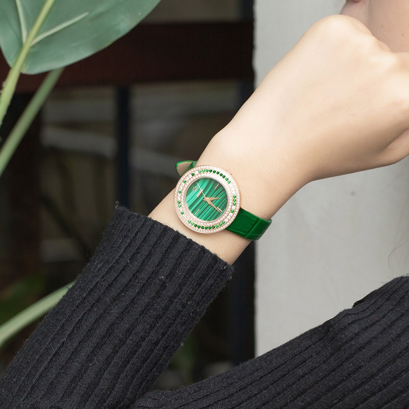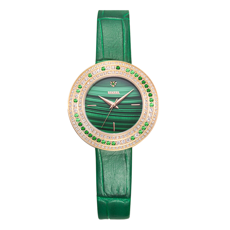 表殼:316L鋼+電鍍玫瑰金,綠圈口:鑲3排水晶鉆 ,彩鉆31顆,白鉆146顆,共177顆。紅圈口: 鑲3排水晶鉆,彩鉆35顆,白鉆142顆,共177顆