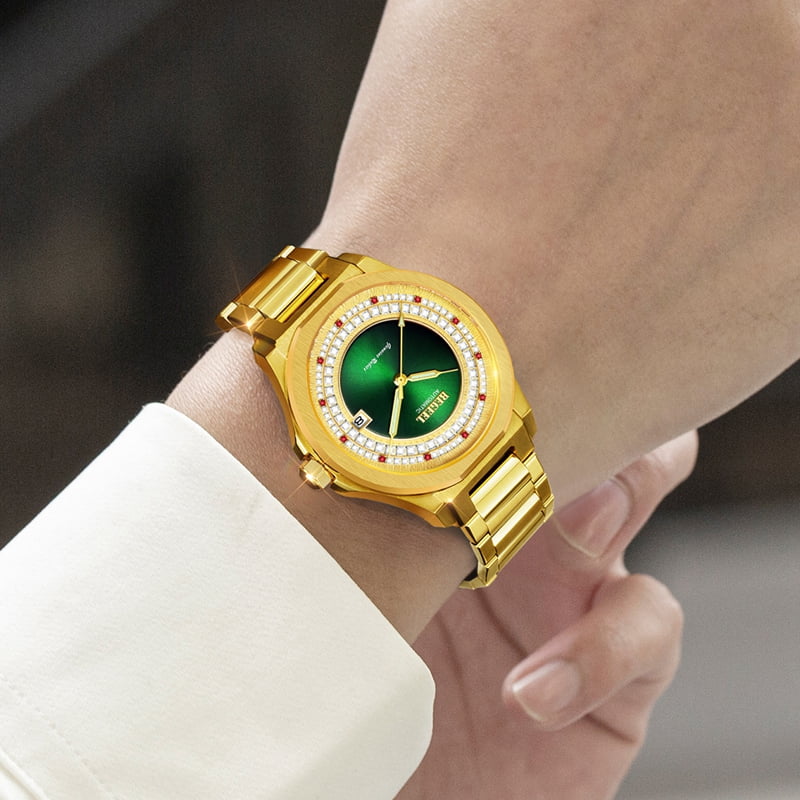 字面:雙紋理,金色流沙紋和綠色太陽(yáng)紋,鑲約105顆方晶鉆,12顆真紅寶石 約0.012ct, 強(qiáng)夜光針