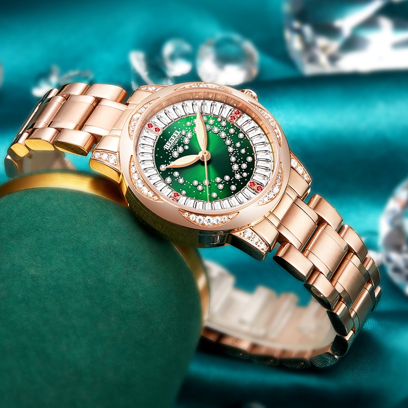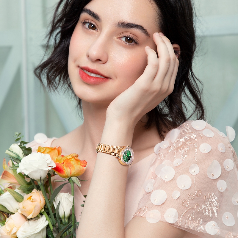 表殼:316L精鋼+電鍍真玫瑰金,圈口鑲54顆晶鉆
