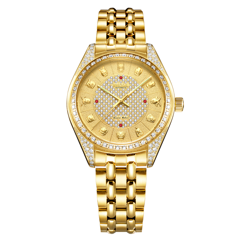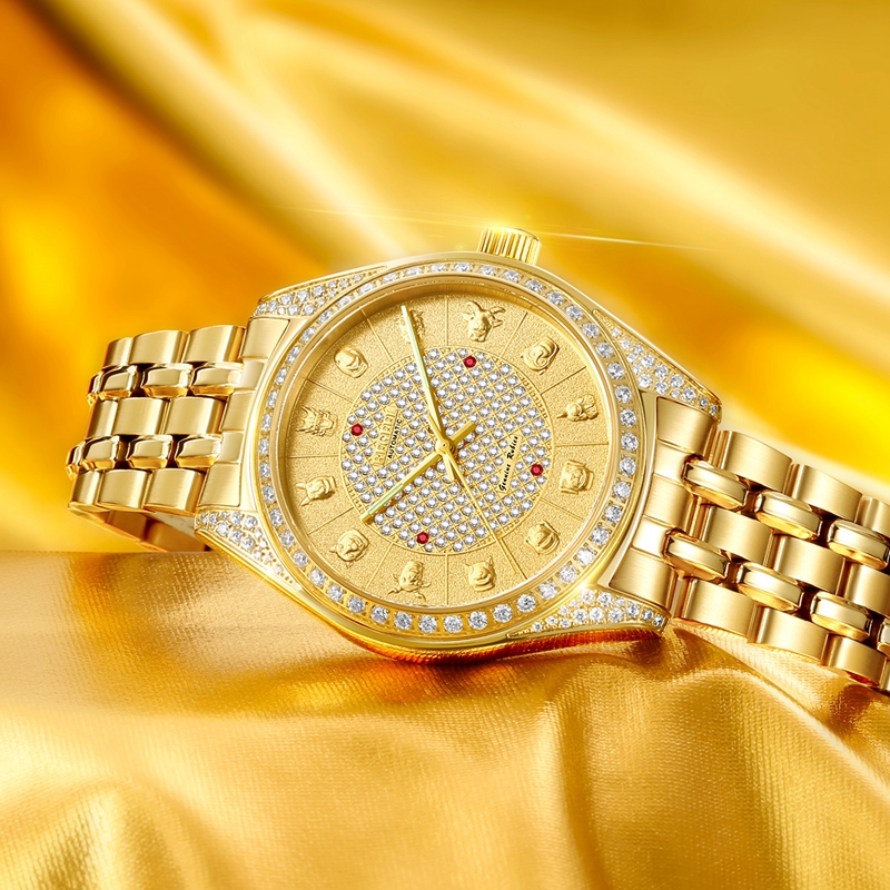 字面:鑲4顆真紅寶石,磨砂金面,刻度位雕刻12生肖電鍍真金,夜光指針,鑲約173顆晶鉆