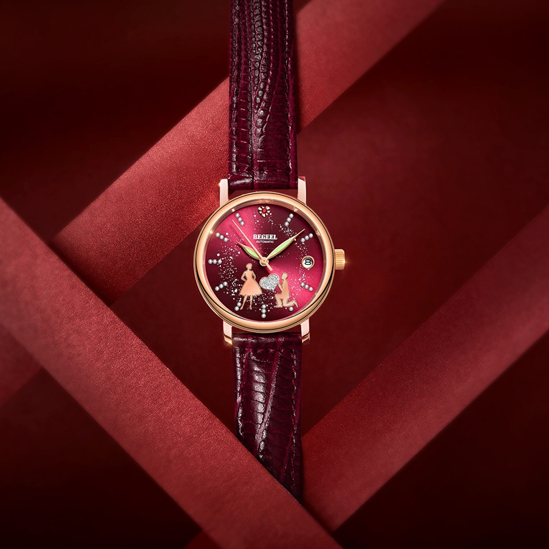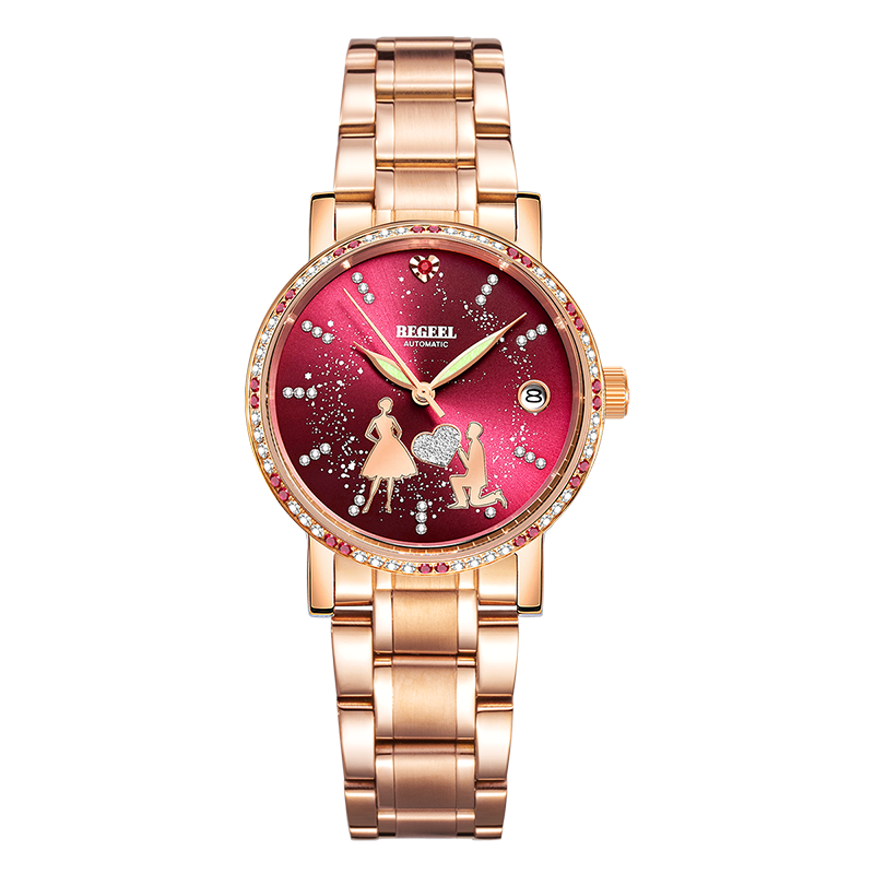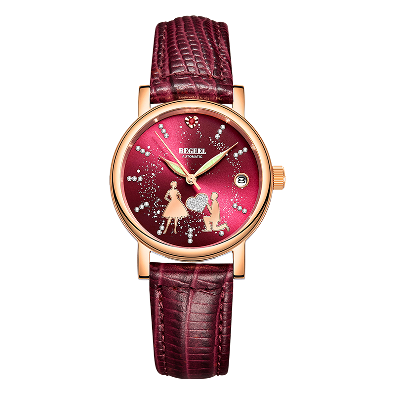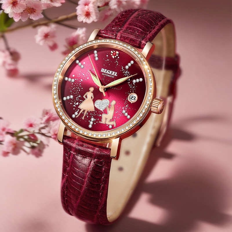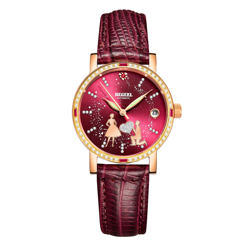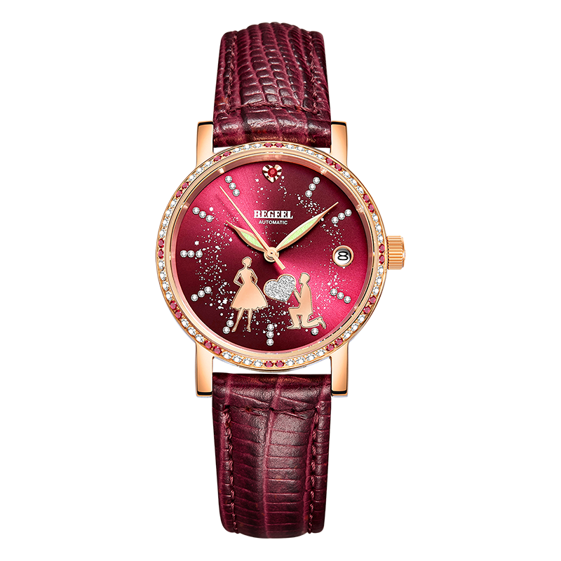 字面:酒紅面,1顆真紅寶石,27顆合成藍(lán)寶石,晶鉆粉心形,強(qiáng)夜光針