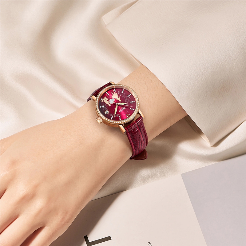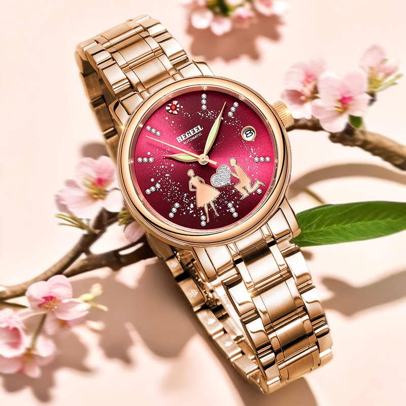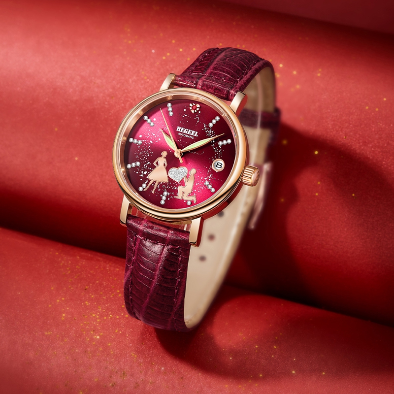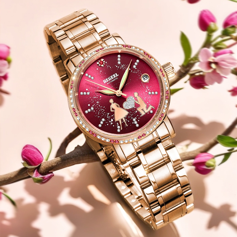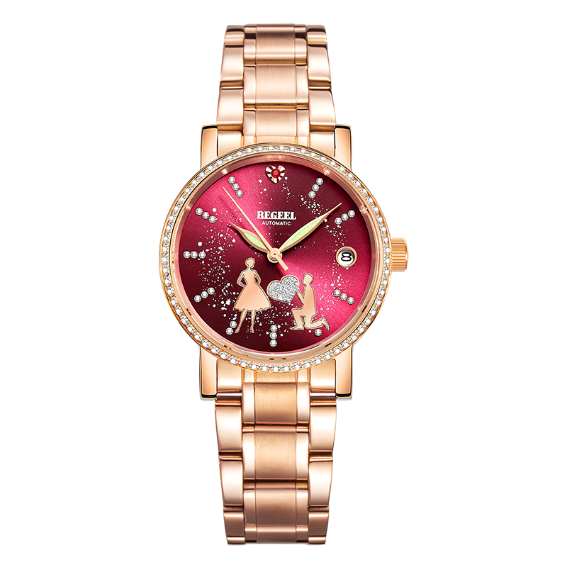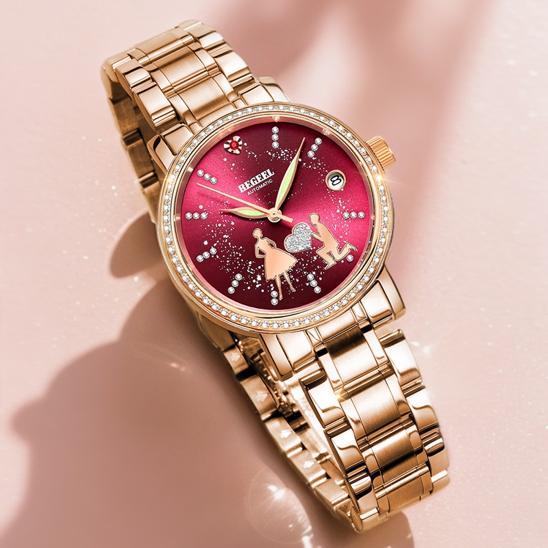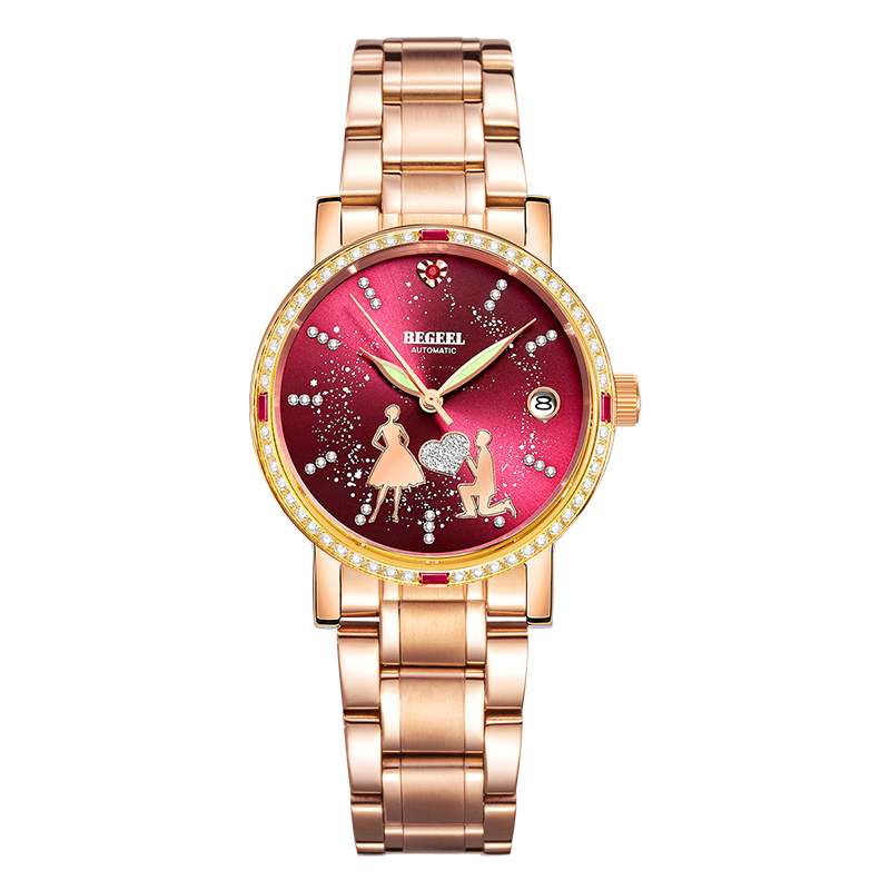 字面:酒紅面,1顆真紅寶石,27顆合成藍(lán)寶石,晶鉆粉心形,強(qiáng)夜光針