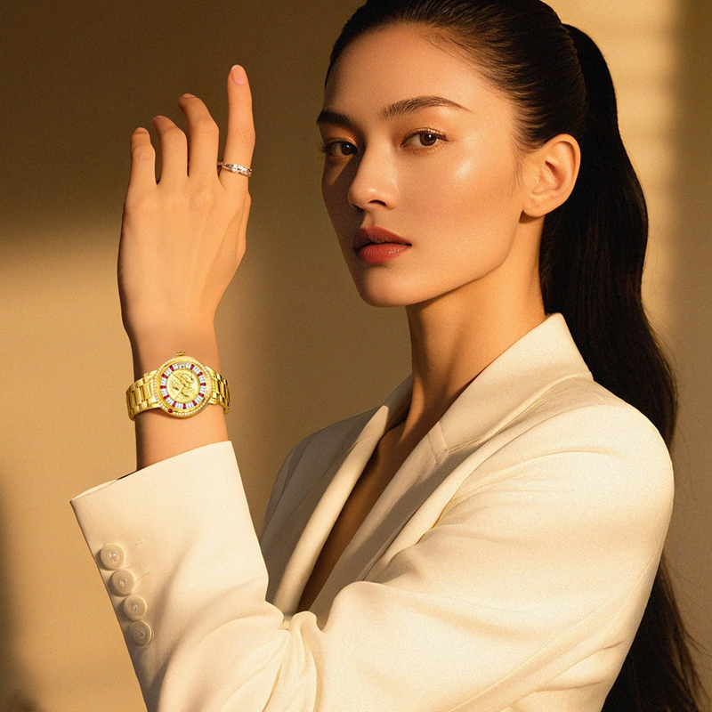 表殼:316L精鋼電鍍金,鑲57顆晶鉆,1顆Big合成紅寶石