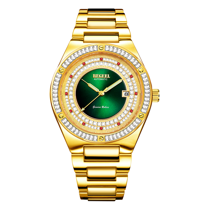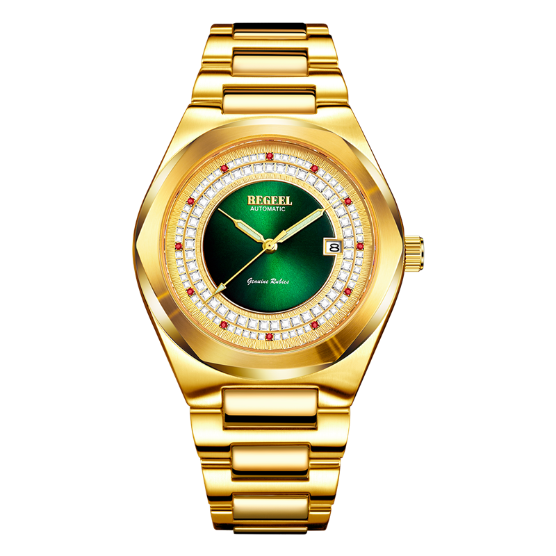 字面:雙紋理,金色流沙紋和綠色太陽紋,鑲約105顆方晶鉆,12顆真紅寶石 約0.012ct, 強夜光針