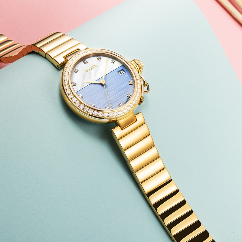 靈感源自愛琴海上海天一色奇景。湛藍的海面上,微醺的海風吹來,掀起浪花朵朵,與遠處澄碧的天空連成一線,仿佛一道美麗的藍色風景線。賓爵設計師將愛琴海的碧海藍天鐫刻表盤,清新淡雅,帶你走入藍與白的純凈世界。清晨,一輪紅日冉冉東升,照射在云海之上,灑下萬丈光芒,如流動的熔巖把海與天的交界處染成了一片金黃。金色海面與金色海灘相互呼應,連成一線,壯美而震撼。賓爵設計師將愛琴海美麗日出復刻于表盤,精致秀美,令人心動不已。