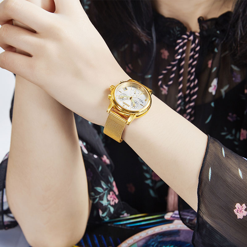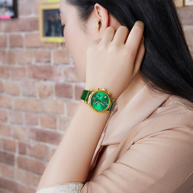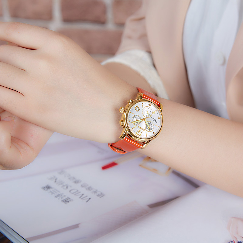 多功能表盤(pán)設(shè)計(jì),功能強(qiáng)大,計(jì)時(shí)方便,4點(diǎn)位開(kāi)天窗顯示日歷,與6號(hào)位的日歷小編盤(pán)緊密呼應(yīng),滿足不同的讀時(shí)需求。米蘭網(wǎng)織表帶和多種顏色頭層小牛皮表帶,隨心搭配。