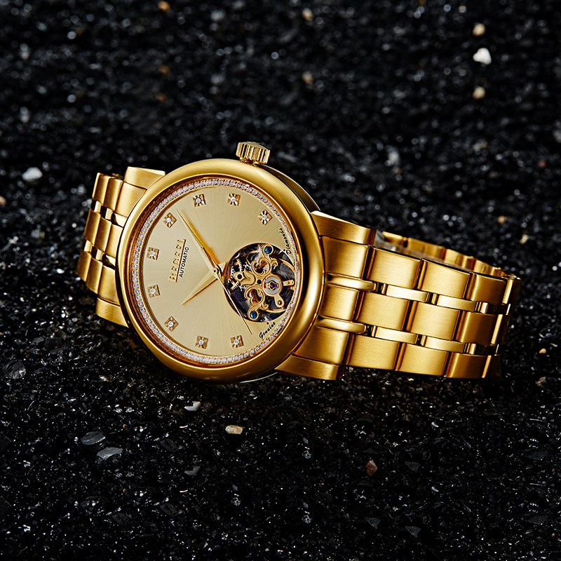 太陽紋表盤,細膩打磨的太陽紋表盤,紋路細膩有光澤,從任何角度都能釋放出耀眼的太陽光芒,時刻吸引他人注目。9顆天然真鉆鑲嵌于時標鉆托之上,釋放耀眼光芒,明證時間的彌足珍貴。6點位開窗設計,可清晰地欣賞機芯游絲的飛速運轉,完美呈現機芯的精華部分,正面感受機械運轉的力量感。